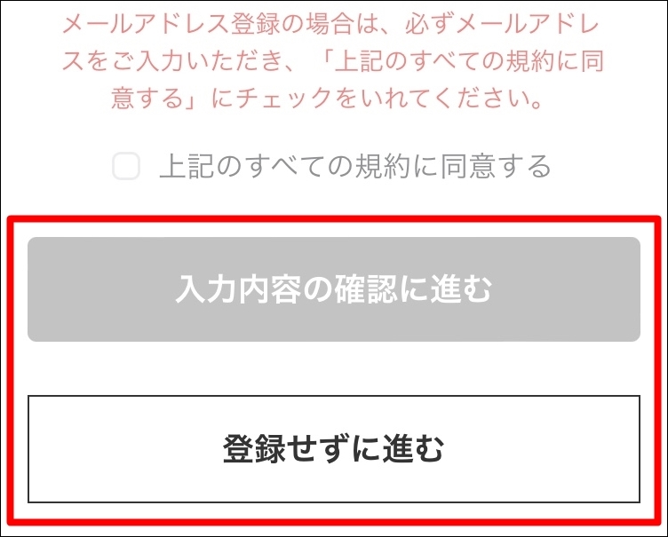 メールアドレスを登録せずに進めた場合は、メールの確認の必要はなく次の⑪に進めます