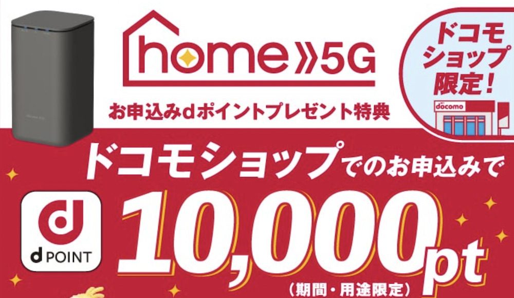 | home 5G のりかえ キャンペーン | 「home 5G プラン」の契約と「home 5G HR02」を購入すると、dポイント最大22,000pt(期間・用途限定) |