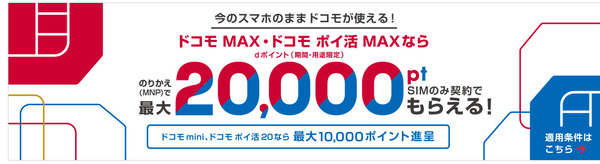| SIMのみ契約で dポイント20,000ポイントプレゼント | SIMのみの購入で初期費用無料、dポイント20,000円pt還元 ※新規契約は10,000ポイント |