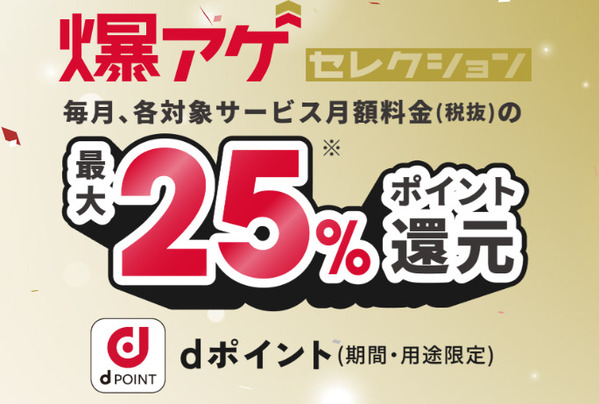 | 爆アゲセレクション | ドコモと提携する映像サービスの月額料金(税抜)の最大20%相当のd ポイント(期間・用途限定)を進呈 |