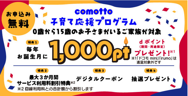 | comotto 子育て応援プログラム | 毎年誕生月にdポイント1,000ptプレゼント |