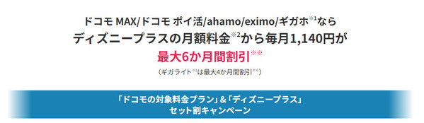 | eximo/ahamo/ギガホならディズニープラスの月額料金1,140円が最大6ヶ月間割引 | eximo/ahamo /ギガホ(「5Gギガホ プレミア」「5Gギガホ」「ギガホ プレミア」「ギガホ」)を契約の方は、月額料金1,140円を最大6か月間割引 |
