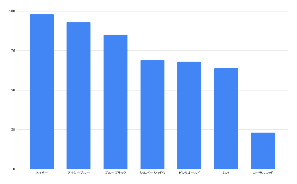 青系のカラー(ネイビー、アイシーブルー、ブルーブラック)が上位を占め、半数以上のユーザーが青系のカラーに魅力を感じています。