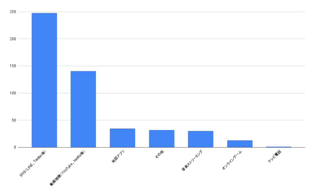 SNSと動画視聴で全体の約78%を占めており、大容量のデータ通信を必要とするサービスの利用が主流となっています。