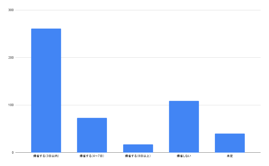 調査対象者の70.2%(351名)が帰省を予定しており、そのうち52.2%(261名)が3日以内の帰省を選択しています。