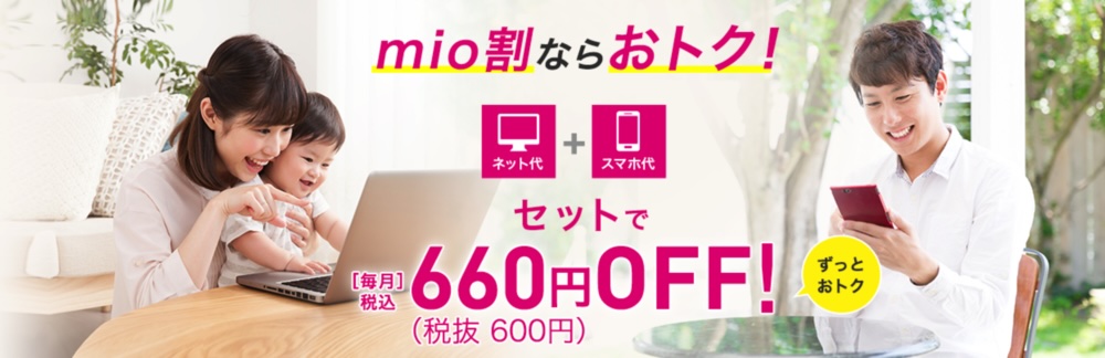 IIJmioとIIJmioひかりを同時に申し込むと「mio割」が適用され、ネット代とスマホ代がセットで毎月660円(税込)割引になります。