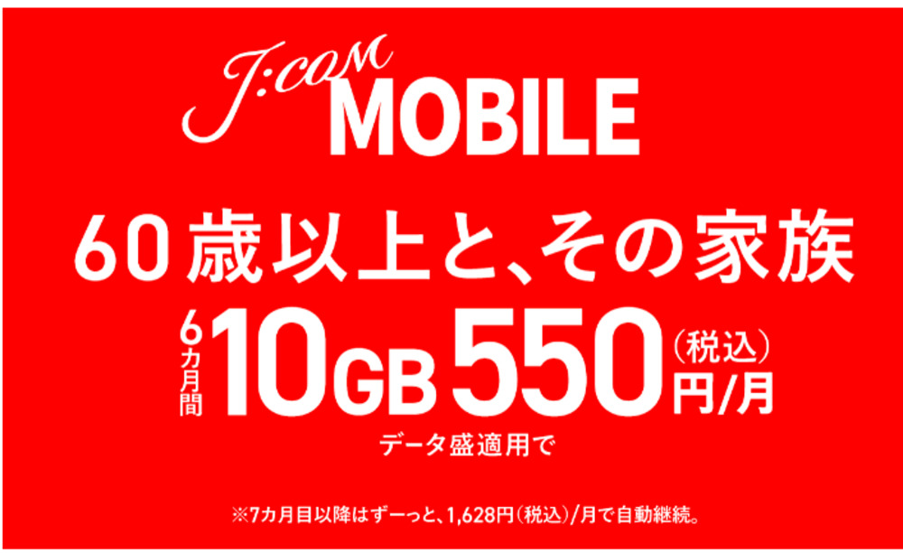 J:COM MOBILEシニア60割(月額割引/カケホ/サポート/迷惑ブロック)
