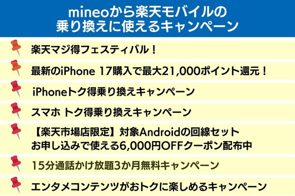 本記事ではmineoから楽天モバイルへ乗り換える方法とメリット・デメリット、楽天モバイルのキャンペーン情報について解説します。