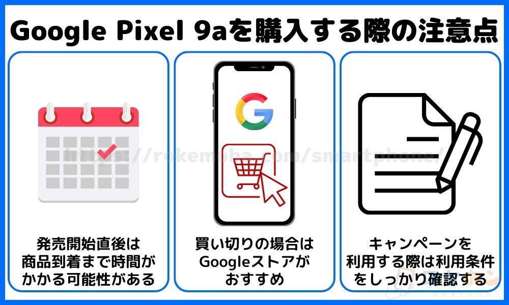 では、続いてGoogle Pixel 9aを購入する際に注意しておきたい点についてまとめました。