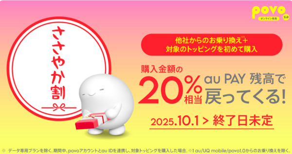 | ささやか割キャンペーン! | MNP&SIM有効化後に対象のトッピング購入で20%相当をau PAY残高還元(不課税) |