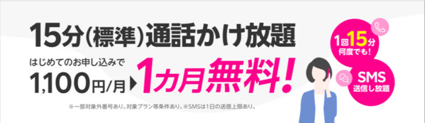 • 【15分(標準)通話かけ放題】料金1カ月無料特典