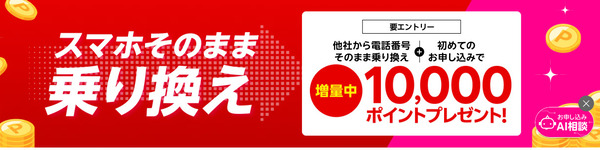 | 他社から電話番号そのまま乗り換え&初めてお申し込みで10,000ポイントプレゼント! | |