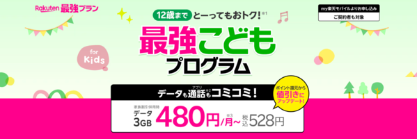 12歳以下のお子様のスマホデビューを応援する「楽天モバイル最強こどもプログラム」 を適用すると、月額料金がなんと528円で利用可能です。