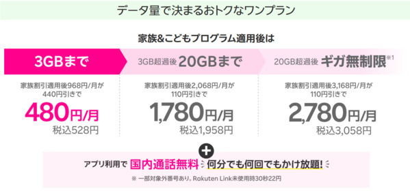 さらに、家族割で110円(税込)引き、そして「楽天モバイル最強こどもプログラム」で440円(税込)引きされるので、月額料金は528円(税込)になります。