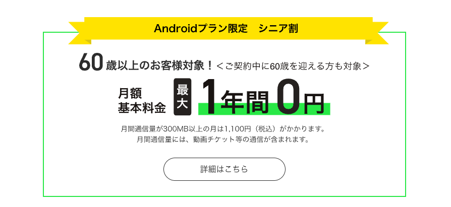 60歳以上の方が対象であり、月間通信料が300MB未満の場合に限ります。