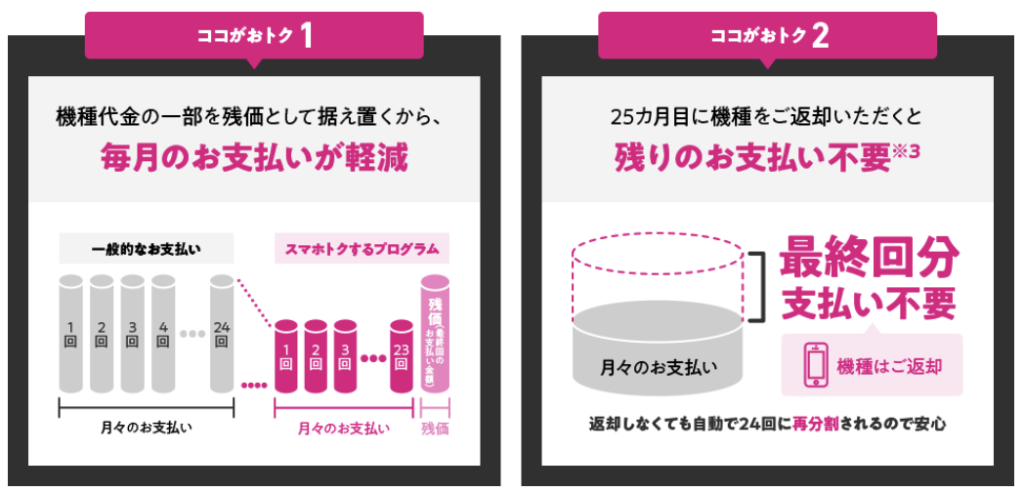 機種代金の一部を残価として据え置くことで、毎月のお支払いを軽減。25ヵ月目に機種をご返却いただくと残りのお支払いが不要(査定条件あり。故障時利用料要)になるもので、おトクにスマートフォンを乗り換えいただくことが可能です。